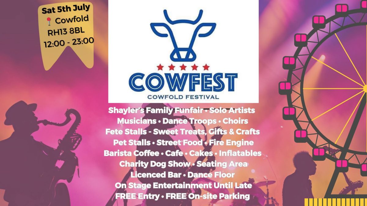 Cowfold Rec Ground CowfoldLocal Festival. Growing every year. We're very pleased to be headlining the Event! No ticket site because it's FREE!! 12pm to 11pm. We're on at 8pm Lots of stalls and lots of FUN! What's not to like. SEE YOU THERE.
