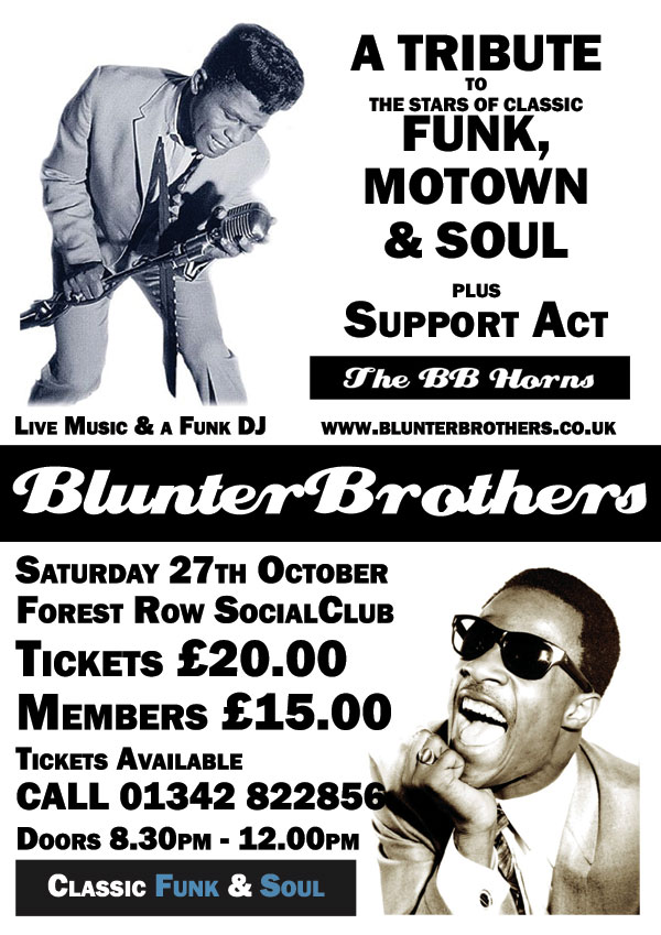 Forest Row Social Club Station Road, Forest Row, East Sussex, United KingdomThe Blunter Brothers return to this great venue. Always a full house so get tickets early to avoid disappointment. Supported by the BB Horns so you get a 98% funky 2% jazzy instrumental set and then the Blunter Brothers bringing you all your favourite Funky Covers. What's not to like! Tickets £20 (£15 for members) […]