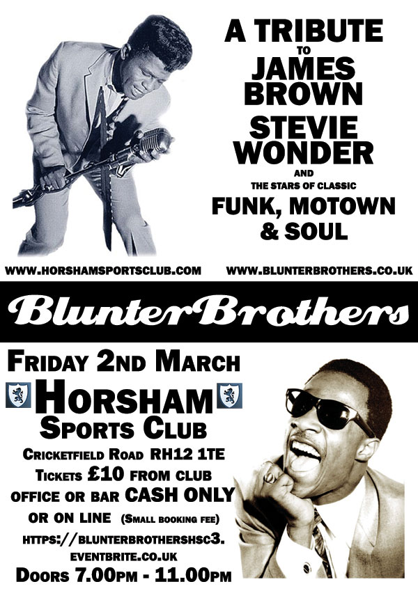 Horsham Sports Club Cricketfield Road, Horsham, United KingdomThe Blunter Brothers return to Horsham Sports Club for another fantastic night of Classic Funk, Motown & Soul! Stevie Wonder, James Brown, E,W&F, Prince, Ray Charles, Curtis Mayfield, even Bruno Mars and many more. Always sells out so get your tickets Early. Available on the door at £10 pp or on line with a small […]